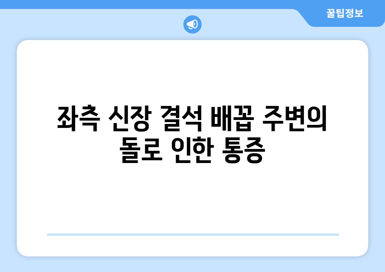 신장 결석은 몸에서 생성된 굳은 물질의 축적으로, 배꼽 주변 또는 좌측 요추 부위에 통증을 유발할 수 있습니다. 다음 표는 좌측 신장 결석과 관련된 통증의 핵심 정보를 요약합니다.