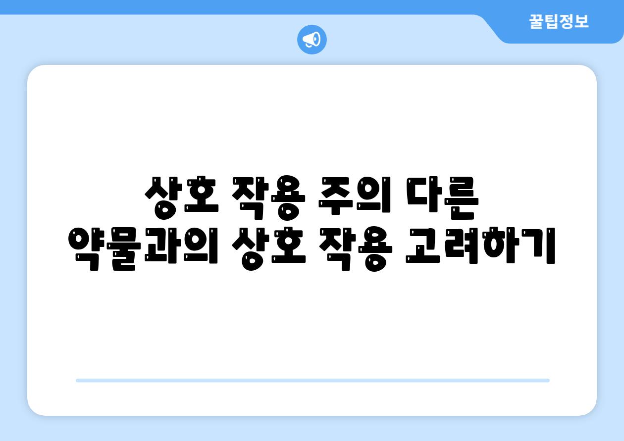 - 시간 간격 유지하기 상호 작용 우려 사항이 있는 경우, 주치의는 시간 간격을 두고 약을 복용하도록 지시할 수 있습니다. 이를 통해 상호 작용이 최소화됩니다.