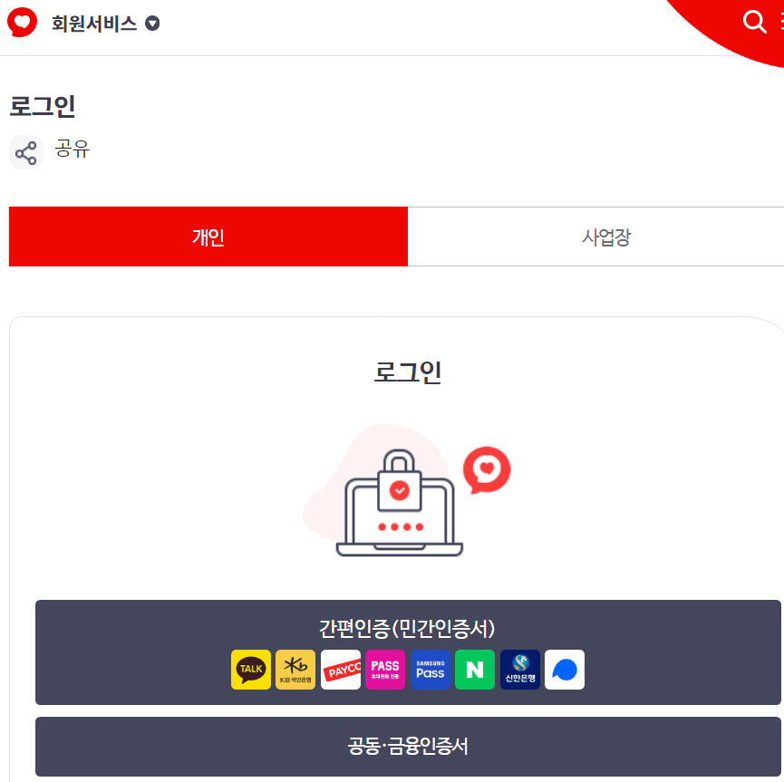 로그인을 진행해주시면 되는데 로그인은 공동 / 금융인증서도 가능하며 통신사 패스 카카오톡,네이버 등 민간인증서로도 가능합니다.
