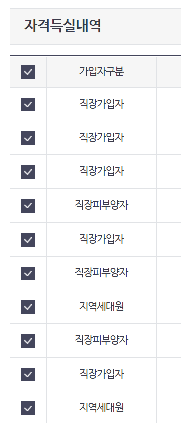 다시 들어가면 위 사진과 같이 자격득실확인서가 쭈욱 나옵니다. 저는 여기저기서 일을 많이 했습니다.