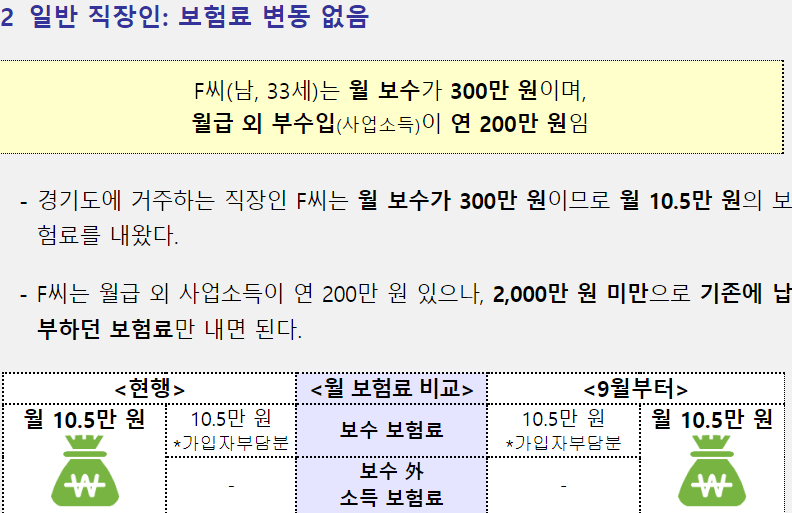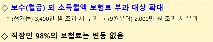 직장가입자는 월급 외 소득에 대한 건강보험료 납부 산정금액 자체가 낮아져 월급 외 소득으로 인한 건강보험료 납부금액이 오를 예정입니다.