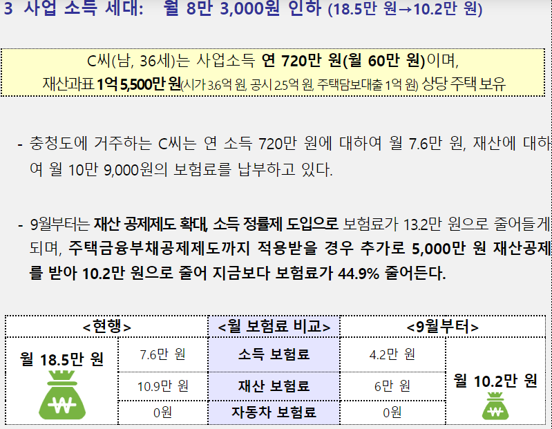 지역가입자의 재산,자동차 보험료 축소 및 소득정률제 도입으로 지역가입자 중 65%의 보험료가 24%(월평균 3만 6천원)낮아져 지역가입자의 건강보험료 부담은 연가 2조 4천억원 가량 보험료 부담이 줄어듭니다.