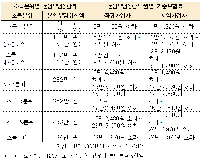 소득분위별 본인부담상한액 및 월별 기준보험료