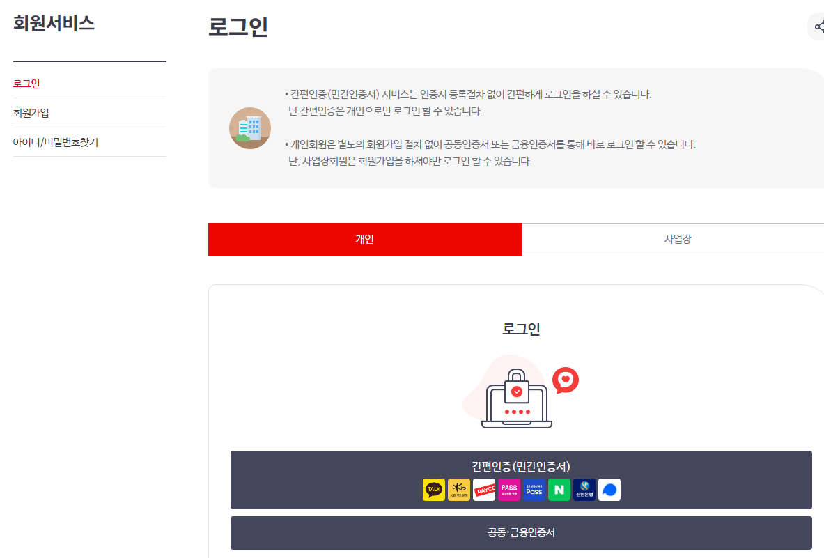 먼저 민간 인증서나 공동, 금융인증서를 통하여 로그인해줍니다.
