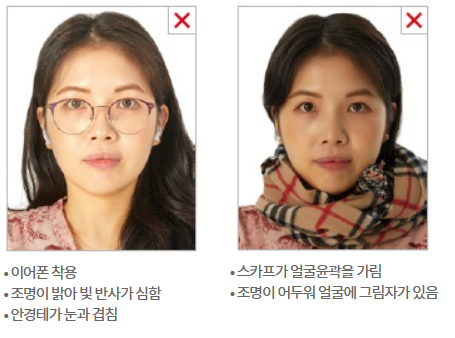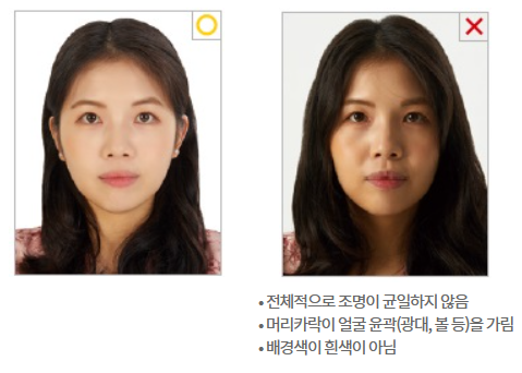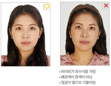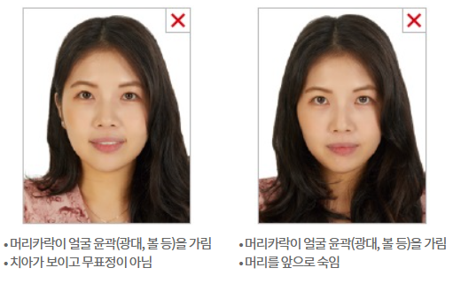 - 머리카락으로 눈을 가리면 안되며 얼굴 전체 윤곽이 완전히 노출되어야 하고 머리카락으로 눈썹 및 볼이나 광대 등 얼굴 윤곽을 가린 사진은 제출 불가