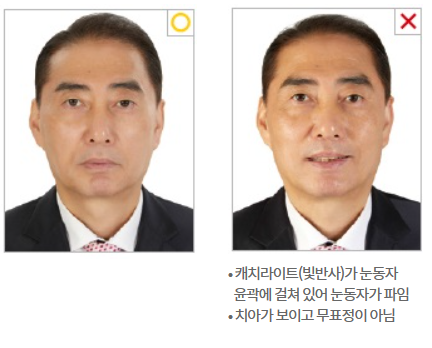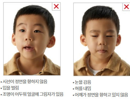 - 입은 치아가 노출되지 않게 다물어야 하며 미소짓거나 눈썹을 올리지 않아야 하며 무표정으로 찍어야 함